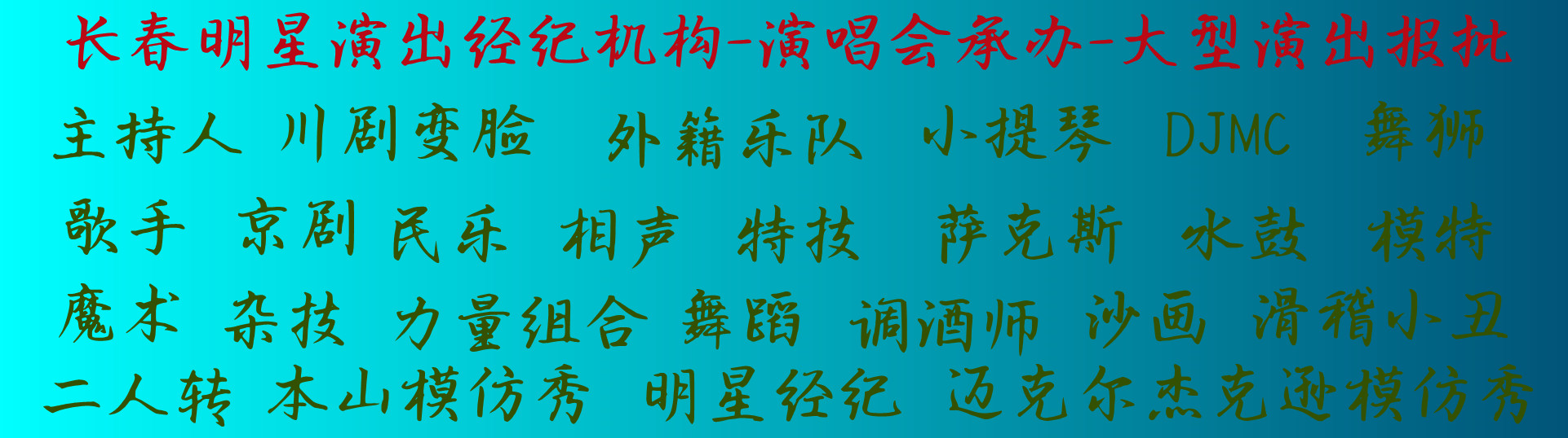 吉林長春慶典演出公司-承接各類慶典演出策劃、開業(yè)慶典、周年慶典、頒獎慶典、商業(yè)演出、演藝團(tuán)隊、開工慶典、奠基慶典、落成慶典、投產(chǎn)儀式、喬遷慶典、會務(wù)論壇活動、行業(yè)會議、高峰論壇、經(jīng)銷商會議、代理商會議、新品發(fā)布會、年會晚會活動、公司企業(yè)年會、年終晚會、文藝晚會、中秋晚會、周年晚會、音樂節(jié)、消夏啤酒節(jié)、明星演唱...